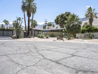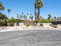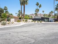 A mid-century modern residential villa in Palm Springs, USA, surrounded by the Arecales landscape and open space with a clear sky above and a road below.