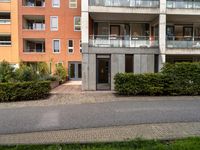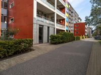 A view of a residential area in the Netherlands, with a mix of modern architecture, office buildings, and condominiums. The scene is populated with fixtures, vegetation, and tinted shades of asphalt and grass, with a cloudy day sky in the background.