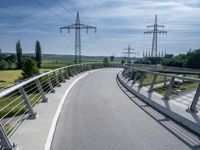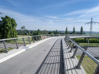 The modern architecture, infrastructure, and urban design of Germany can be seen in this landscape, featuring a road, bridge, overhead power lines, buildings, trees, vegetation, and more, against a clear sky and tar road surface.
