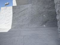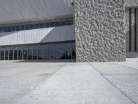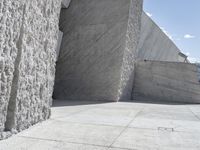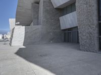 The multi-level architecture of Tenerife, Spain, is created from a combination of concrete, composite material, and limestone. The buildings are surrounded by a symmetrical walkway, road, and stone wall, all elevated off the ground. The clear sky allows for shadows to be cast across the road surface and window facade creating a modern, futuristic style of architecture.