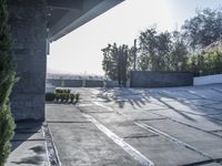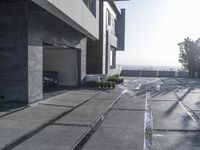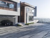 A modern residential estate in Los Angeles, California, USA. The property includes a mid-size car, a driveway, a cobblestone path, a garage door, windows, a bridge, trees, and a variety of surfaces including concrete, brick, asphalt, tile, marble, and wood.