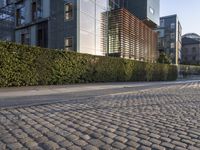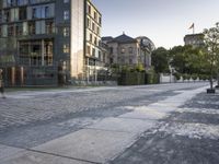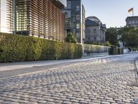 A snapshot of a residential area in Berlin, Germany, featuring modern architecture, cobblestone roads, and trees lining the facade of the office buildings. The clear sky and sunshine make the perfect backdrop for this urban design.