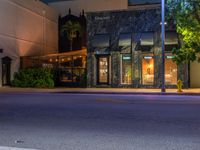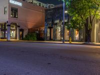 The bustling urban life in Miami Beach, Florida, USA is illuminated by artificial light as shoppers explore the modern architecture and street lights that line the road at night.