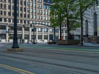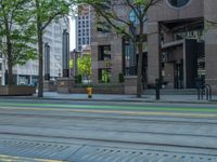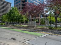 the green paint is painted on a bike path in front of an office building and large, trees