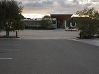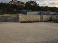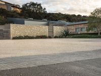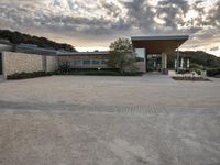 A contemporary residential building located in California, USA. The photo captures the architecture at dawn, with clouds hovering above. The building is surrounded by an open space, with a parking lot on the dirt and asphalt surface. The property features a stone wall, a courtyard, and a suburban villa. The grey sky adds a touch of gloom to the scene, while trees, grass, and cobblestone driveway create a serene atmosphere.