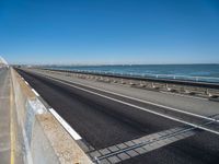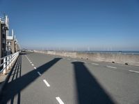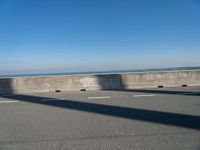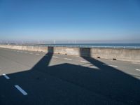 A winding road made of asphalt and tar with a modern infrastructure, parallel lines of street lights, and a shoulder for bicycles, meanders through a coastal Dutch city surrounded by a calm lake, a beach, and a clear sky. The skyline is punctuated with wind turbines, while the horizon is dotted with windswept clouds.