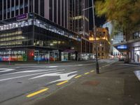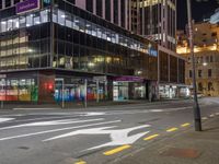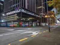 A stunning view of a modern skyscraper with a facade illuminated by artificial light in a bustling city business district at night.