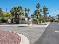 A residential villa in the heart of Palm Springs, California, USA, stands proudly against a backdrop of the Sonora Desert and a clear blue sky. This mid-century modern architecture features an asphalt road and a palm tree, typical of the suburban landscape in this area.