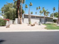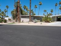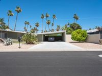A mid century modern villa in Palm Springs, California, USA, with a driveway entry highlighted by a low bush hedge and a palm tree against a clear sky. An asphalt road winds through a residential area of the Sonora Desert.