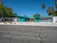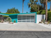 A lush, mid-century modern architecture villa located in the Sonora Desert in Palm Springs, California is seen from a low angle, with a driveway, parking lot, and parking garage leading straight down the road, lined with trees and a green hedge.