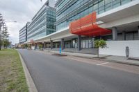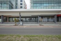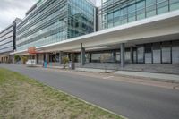A view of a modern office building with a sleek facade and large windows in a bustling city.