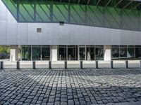 A view of the modern urban architecture of Berlin, Germany, featuring buildings, homes, office buildings, public spaces, curbs, cobble stones, wall, infrastructure, roofs, estates, fences, transport, urban design, profiles, arenas, stadiums, vehicles, metals, residential areas, road surfaces, lanes, human settlements, concrete, floors, floorings, glasses, walkways, modes of transport, parking lots, and more.