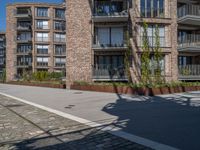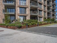 This stunning stock photo captures the essence of city life in Germany, showcasing the modern architecture and urban design of a residential area. The image features a road lined with brick walls and cobblestone, leading to a warehouse or storage facility. The clear sky casts hard shadows on the asphalt, adding depth to the composition. The combination of clear lines, contemporary design, and historical elements creates an intriguing contrast. This photo is perfect for illustrating urban living, architectural concepts, or showcasing the beauty of Germany.