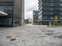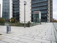A view of the modern cityscape of Lisbon, Portugal, with a mix of high-rise buildings, office towers, residential areas, public spaces, and infrastructure. The rectangles of asphalt and composite material form the roads for pedestrians and vehicles, while the curb, vegetation, and trees add to the urban design of the neighborhood.