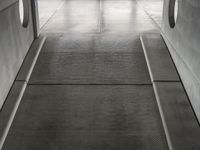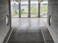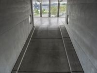 A straight road lined with modern architecture and urban design in Berlin, Germany leads up to an elevated parking deck with a view of a cloudy foreground.