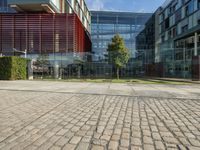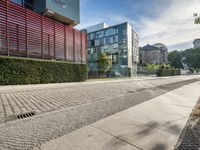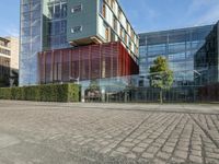A view of a modern mixed-use office building in a residential area of Berlin, Germany. The building facade stands out against the clear sky and cobblestone road surface, adding to the city's urban design and metropolitan area. This snapshot captures the city's profile and its open public spaces.