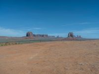 In the vast expanse of Monument Valley, Arizona and Utah merge into a stunning landscape of open spaces and dirt roads. Gravel and dirt tracks wind through the natural beauty, under a sky dotted with clouds. This off-road paradise offers profiles of rugged terrain, inviting exploration on a day filled with adventure and discovery.