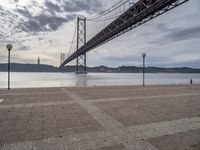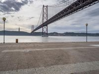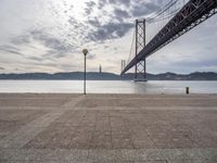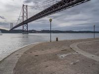 The break of day brings a calm to the coastal road of Lisbon, Portugal, where the tarred asphalt of the roadway leads out to the cumulus-strewn horizon and the ocean pier beyond. The street lights and landings of the jetty are illuminated as the lake and trees provide a natural backdrop to the open space of the underpass and bridge.