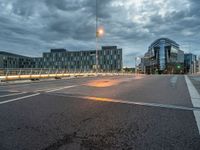 A bustling cityscape of Berlin, Germany at the break of day. The urban design features a modern architecture of high-rise buildings, a financial district and residential areas. Streets are illuminated by street lights, and lined with trees, electric wires, asphalt and a variety of modes of transport.