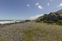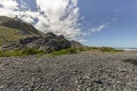 A stunning mountain landscape with lush green grass, towering peaks, and a serene water resource flowing through the valley.