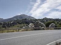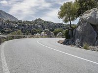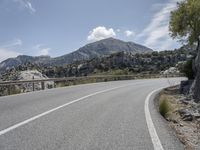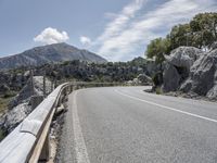 A scenic view of a mountain range in Mallorca, Spain with a road winding through the landscape. The sun is shining brightly on the clear day, revealing the varied features of the Armco barrier, road surface, trees, cliffs, vegetation, and infrastructure in the foreground. The mountain range creates an impressive backdrop to the panoramic view.