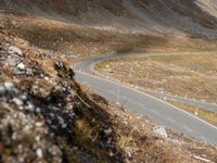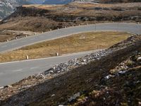 Aerial view of asphalt roads winding through the highlands of Austria, surrounded by a lush, natural landscape of grass, trees, and rocky mountain landforms illuminated by bright sunshine.