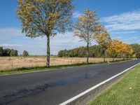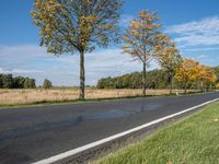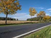 The autumnal landscape in Germany's rural countryside is a sight to behold, with its lush vegetation, clear sky, and horizon of green fields and woods. The tar road surface winds through the natural environment, with sunlight filtering through the leaves of a tree, while a distant twig casts its profile against the cloud-filled sky.