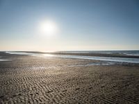 A tranquil and serene atmosphere is visible in this picture of the Holland coast on a sunny day. Azure waters of the ocean meet a sandy beach, with a coastal wetland and sand dunes visible in the background. Wooded areas and open space provide a natural environment for the shore, with clear skies and sunlight creating a peaceful and calm atmosphere.