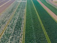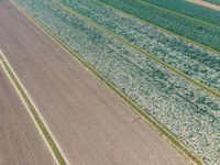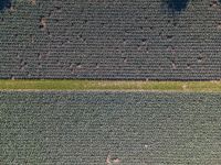 Aerial view of a rural landscape in the Netherlands, featuring a lush grass family, tree trunks, and a watercourse. The azure sky and beige and brown soil contrast with the parallel roads, infrastructure, and concrete and asphalt flooring.