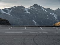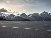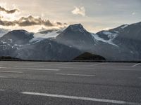 A car arrives at a scenic overlook in the Austrian highlands, surrounded by glacial mountains, trees, and vegetation at break of day. Freezing cumulus clouds hang above the horizon in the clear sky, and the sun's first light casts a dramatic profile on the asphalt road surface below.