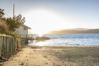 A stunning view of the New Zealand coast at dawn, with low tides, sandy beaches, and calm waters.