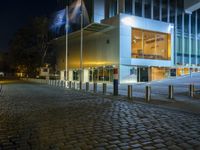 A view of the modern architecture in the business district of Berlin, Germany, at night. The illuminated buildings showcase a mix of different styles with their striking facades, glass windows, and yellow lighting. The city's metropolitan area is known for its vibrant business scene and impressive office buildings. The cobblestone road surface adds charm to the urban landscape. Europe's business hub is a blend of light and dark, creating a captivating profile against the night sky. The tree-lined streets and tiled flooring complete the city's dynamic atmosphere.