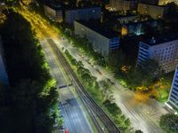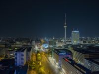 A stunning view of the metropolitan area of Berlin, Germany at night, with high-rise buildings, skyscrapers, and city lights illuminating the urban metropolis. The cityscape showcases the beautiful skyline, downtown streets, and street lights, creating a captivating atmosphere. The illuminated stadium and elevated road add to the vibrant energy of the city. This panoramic shot captures the blend of architectural marvels, nature, and infrastructure in this European metropolis.