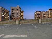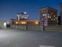A modern cityscape of Salt Lake City, Utah, USA, featuring an office building, a concrete road, a parking garage, and artificial light illuminating the city at the break of day.