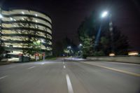 The asphalt road illuminated by street lights and artificial light in the city of Los Angeles, USA, creates a modern urban design with motion blur and a one-quarter angle.