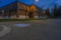 A view of a cityscape at night in Toronto, Ontario, Canada. The urban landscape is illuminated by artificial lights, casting a warm glow on the buildings, roads, and vegetation. A row of street lights and a parking lot add to the urban design of the residential area. The dark sky is filled with clouds, creating a dramatic atmosphere.