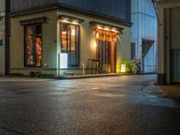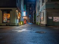 View of a wet road at night in the city of Tokyo, Japan, with store fronts lit up by artificial light and a street light in the one quarter profile view.