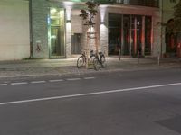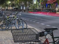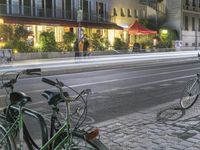 two bicycles are parked along a street next to a sidewalk in front of buildings with tables on both sides of them