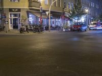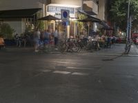 people are walking through the street outside at night time with umbrellas overhead, outside a cafe on sidewalk