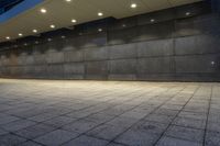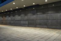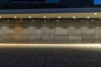 a black stone wall lit up by lighting at night with low lighting on the floor