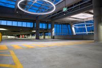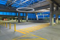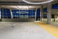 A straight road illuminated by artificial light in the open space of Toronto, Canada, showcasing the city's concrete streets and dark night atmosphere with a parking deck in the background.