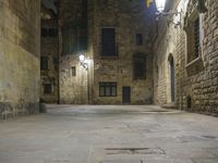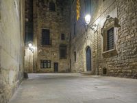 A stunning night view of the historic architecture in Barcelona, Spain. The low lighting illuminates the beautiful brick buildings and cobblestone streets, creating a charming atmosphere in the old town.