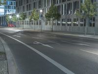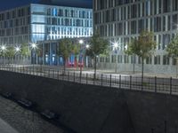 A cityscape of Berlin, Germany, showcasing the modern architectural buildings illuminated by street lights at night.