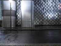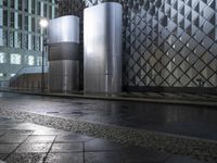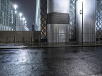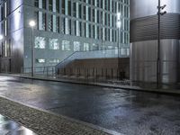 A stunning night view of the modern architecture in Berlin, Germany, showcasing the city's urban design and futuristic architectural elements. The illuminated buildings reflect on the wet surface, creating a captivating scene.