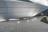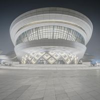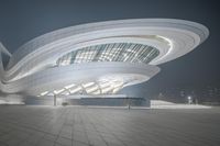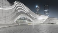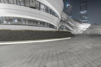 A stunning night view of the modern architecture in the city, with a clear sky and artificial light illuminating the buildings and creating a futuristic atmosphere.