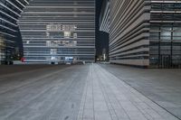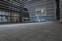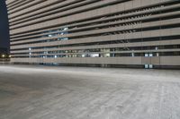this is an empty concrete floor at night, near a tall building with futuristic architecture
