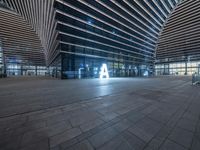 large modern city building with lights reflecting in the windows and concrete flooring and tiles