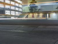 A stunning night view of the modern architecture in Los Angeles, California, USA. The city lights illuminate the streets, casting a beautiful glow on the asphalt roads and showcasing the urban design. Tall office buildings with sleek facades and large windows create a striking silhouette against the night sky. The trees and vegetation add a touch of nature to this bustling business district. The street lights and artificial lights create captivating light streaks, giving the scene a sense of motion and energy.