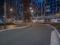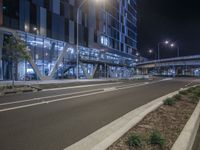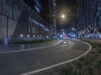 A stunning night view of a modern city with tall office buildings, illuminated street lights, and a clear sky.