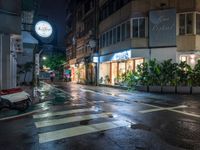 A top down, aerial view of the city of Taipei in the Republic of China, illuminated by street lights, neon lights, and shopfronts. Urban design, city life, and wet roads are seen from a high position on a dark and rainy night.